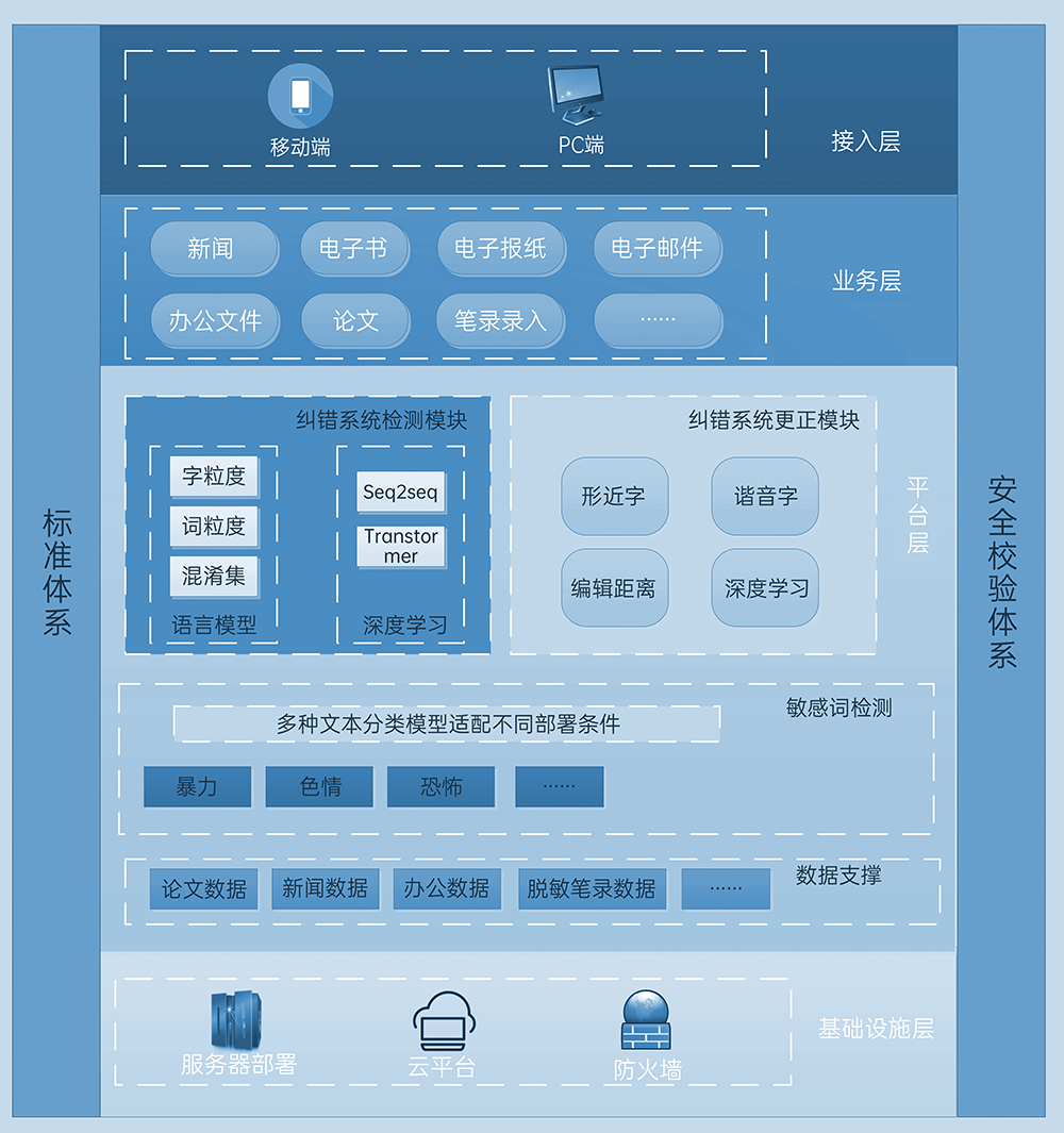 欣誠智語通-文本糾錯檢測系統(tǒng)檢測模塊包含語言模型和深度學(xué)習(xí)模型組成,語言模型主要從字粒度、詞粒度、混淆集進行錯誤檢測,深度學(xué)習(xí)模型由seq2seq序列模型和強大的上下文信息處理能力的transformer模型組成。糾錯模塊通過形近字、諧音字、深度學(xué)習(xí)等方式完成文本糾錯功能。論文數(shù)據(jù)、新聞稿件數(shù)據(jù)、筆錄數(shù)據(jù)等行業(yè)數(shù)據(jù)做為模型訓(xùn)練支撐。