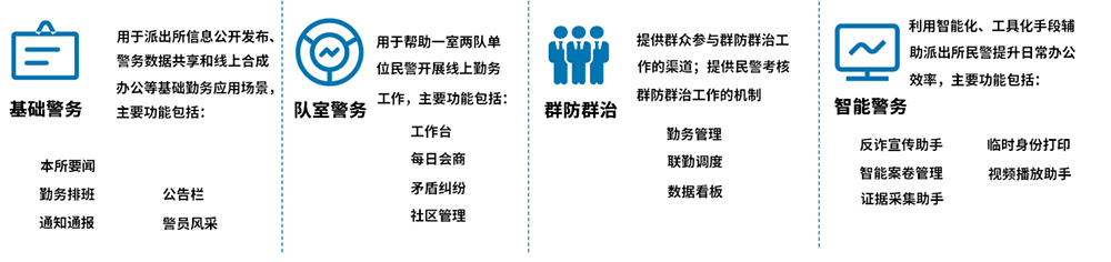 搭建派出所平臺(tái),提供了所內(nèi)信息公開(kāi)發(fā)布、警務(wù)數(shù)據(jù)共享和線上合成辦公的能力,同時(shí)配套了一系列智能警務(wù)工具。